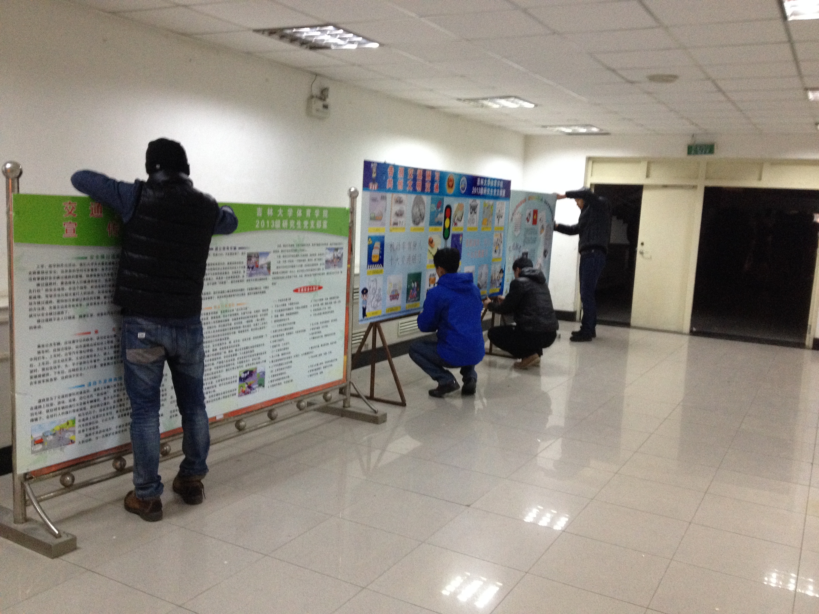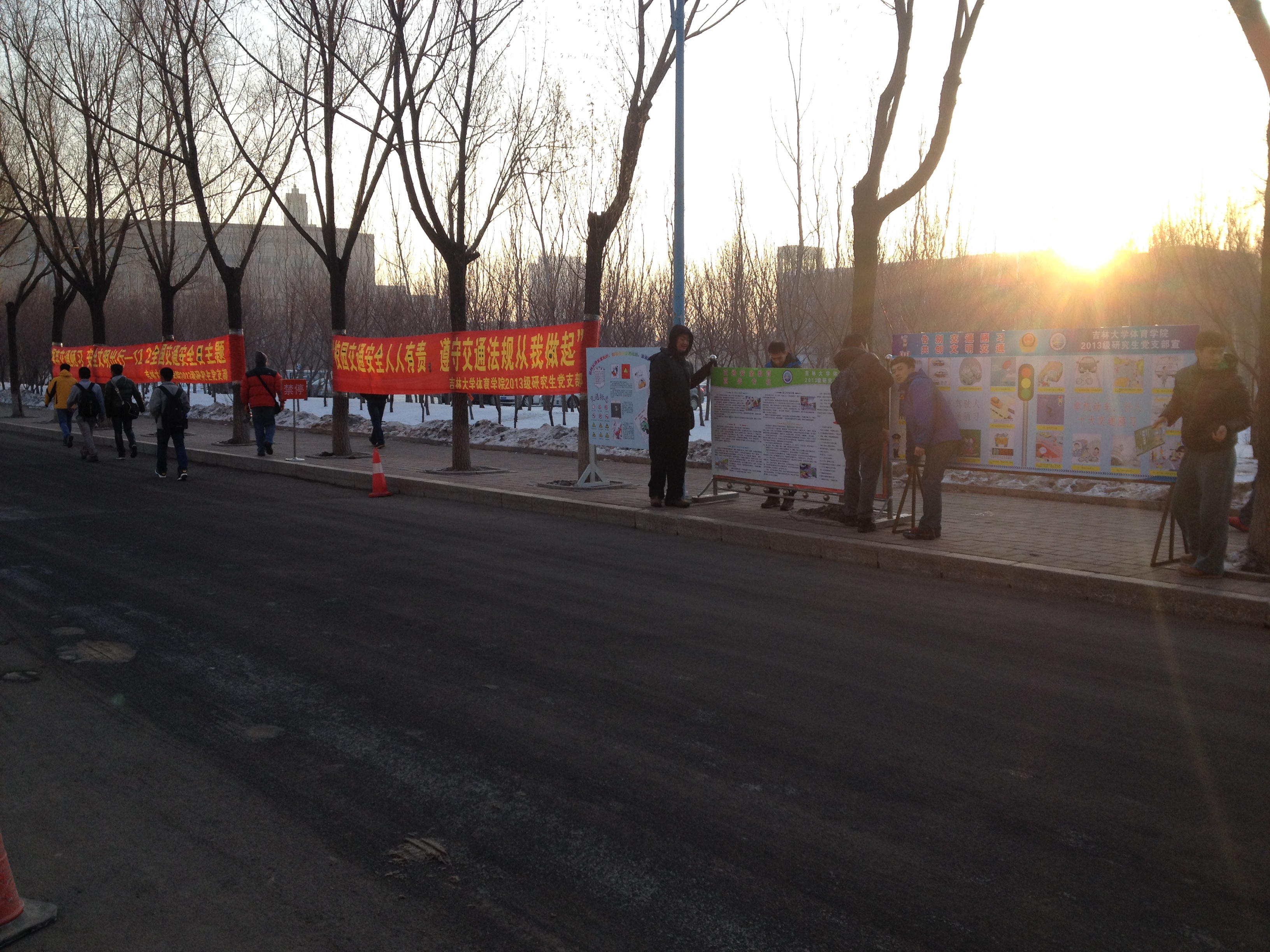 党员和积极分子分工合作,首先将条幅、展板、宣传单页等活动准备材料取回。由于冬季天气寒冷风大,为了保证条幅在外悬挂时的稳定性,首先对条幅进行了防风处理,后对展板精心布置,增加了展板的可观赏性和稳定性,准备工作完成后,党员和积极分子分组将条幅的悬挂在行政楼南侧、体育馆北侧、中国银行自助银行北侧沿线等主干路两侧,这里也是人流、车流汇集、叠加的路段,更是确保校园交通安全的重点路段,最后,党员和积极分子同学们又将展板摆放到行政楼南侧,展板由“交通法规”、“交通标志”、“安全出行要点”、“校园交通注意事项”、“机动车和非机动车、行人十大交通陋习的危害”等交通安全知识,交通法规组成的,条幅和展板刚刚布置好,就吸引了许多同学驻足观看,同学们在图文并茂的宣传中了解了交通安全知识和法规,也理解了交通陋习的危害,增强了同学们交通安全意识。在布置条幅和展板的过程中多次遇到校警同志,他们认为本次宣传活动主题和内容都非常实用并有着积极的意义。