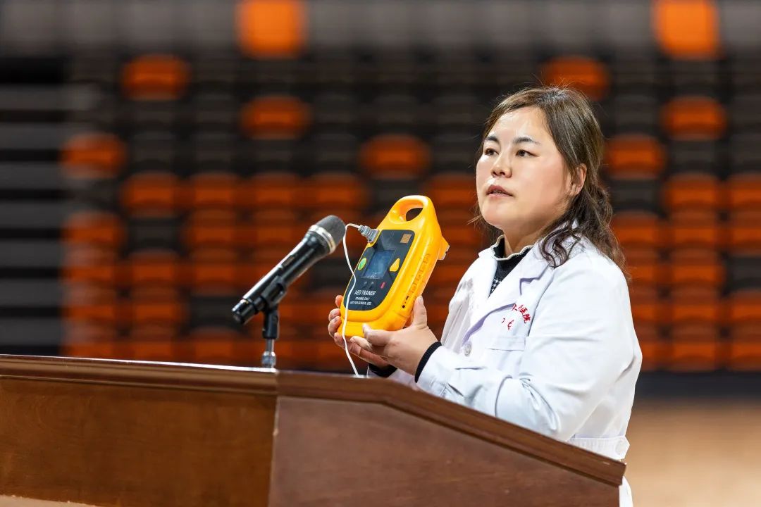 校医院护士长于巍红利用仿真教具演示了现场了心肺复苏+AED除颤仪的操作方法与流程。