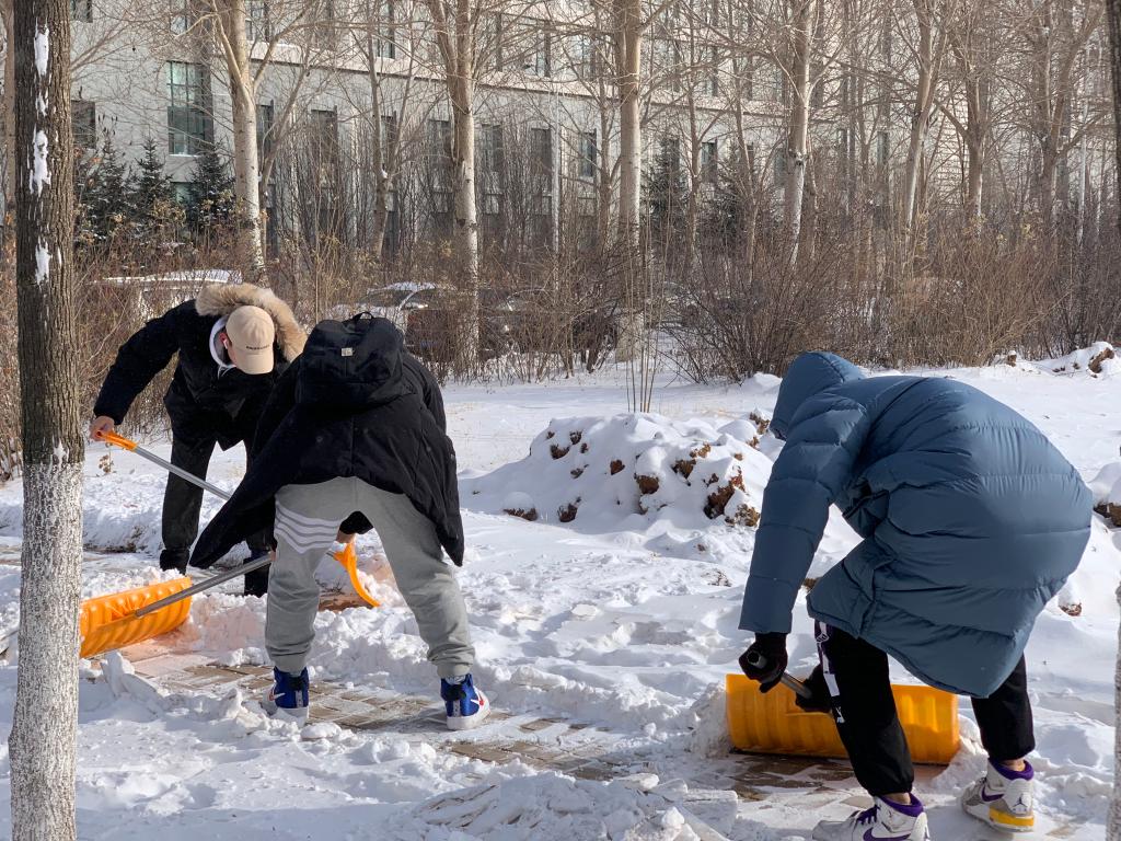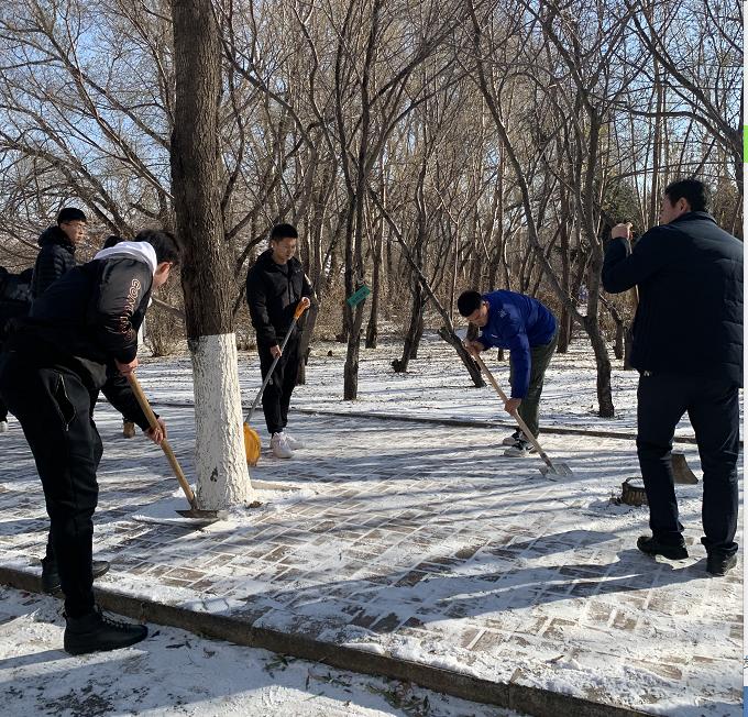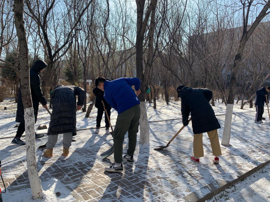 为保障全校师生出行安全,消除冰雪路面安全隐患,bb贝博艾弗森官方网站团委于2019年11月14日、18日中午组织了志愿扫雪活动。学院党委副书记兼副院长田进,辅导员宫勖能,以及各年级学生干部、入党积极分子参加了此次活动。