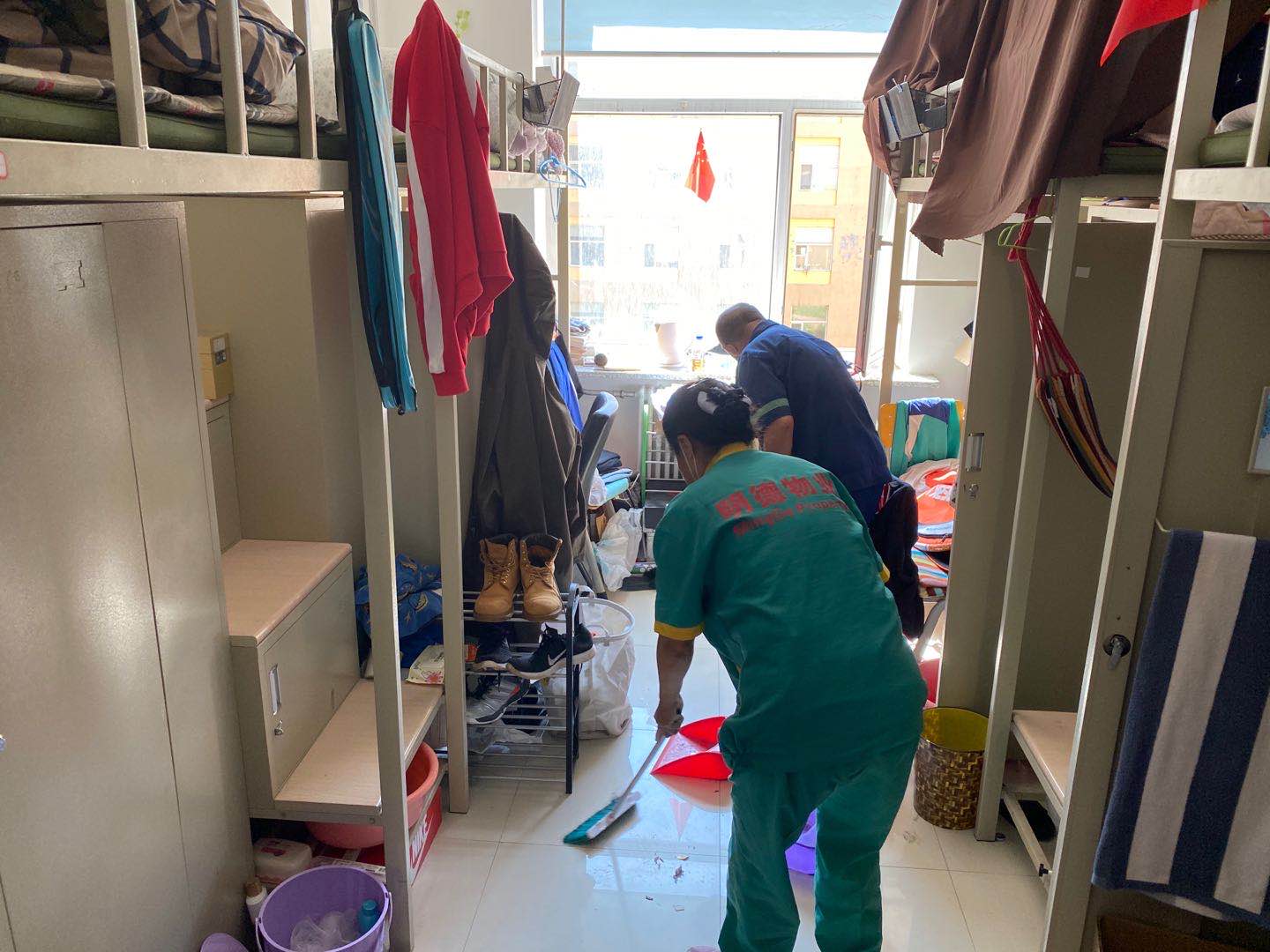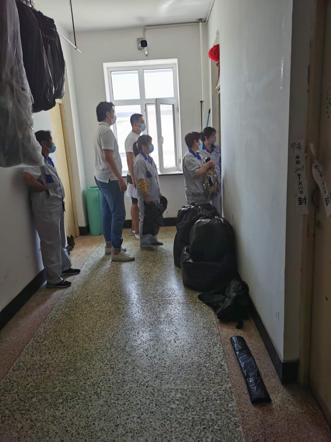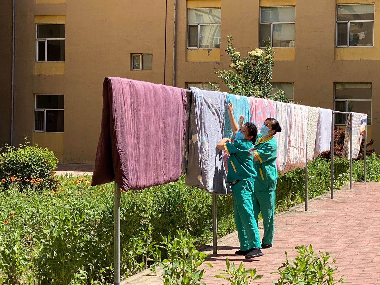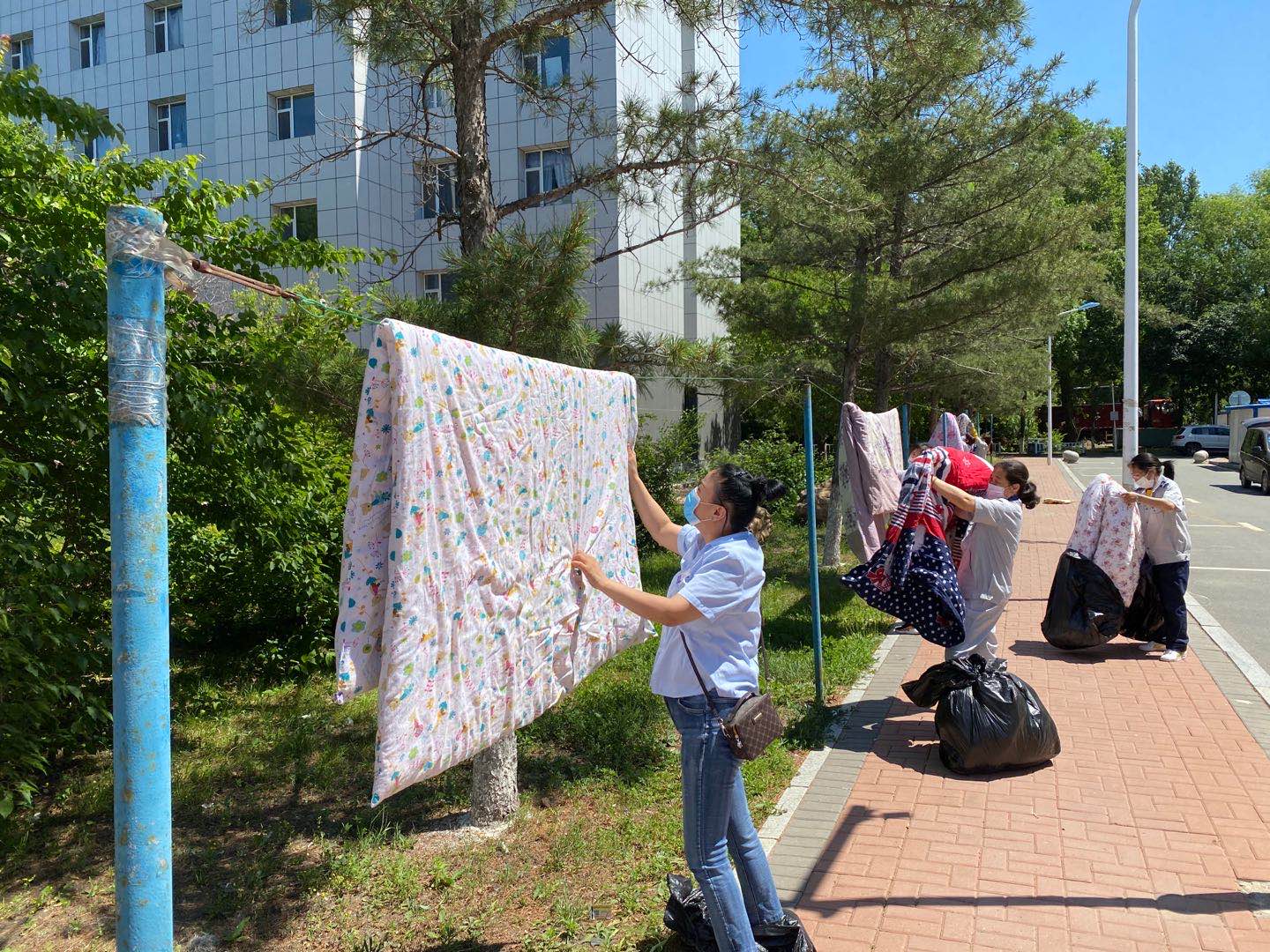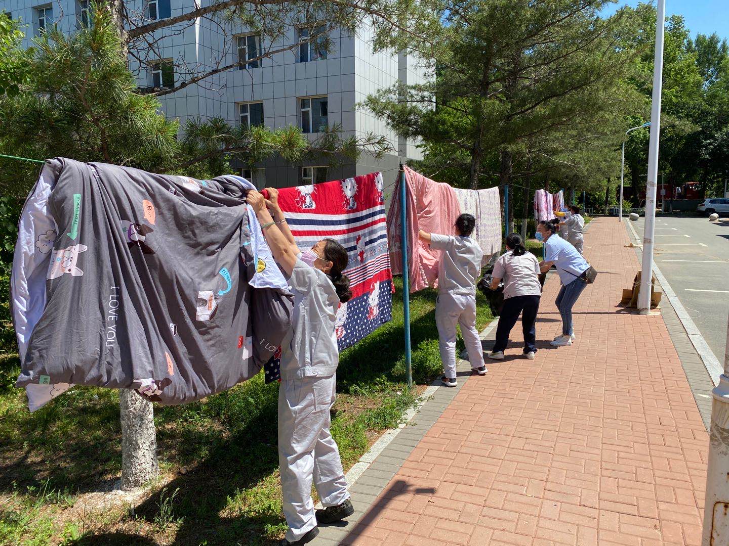 6月16日上午9点,bb贝博艾弗森官方网站辅导员、前卫校区后勤服务中心公寓部工作人员、明德物业工作人员聚集在学生公寓门前,按照事先整理好的有诉求学生名单,逐一房间为学生晾晒被褥、清理垃圾。工作人员早已准备好名帖,分别在公寓床、被褥上做好标记,防止物品弄混、丢失。大家分工明确,擦栏杆、取被子、夹标签、晒被子、收回等一整套流程,全部由专人负责。最后,物归原位,叠得整整齐齐。