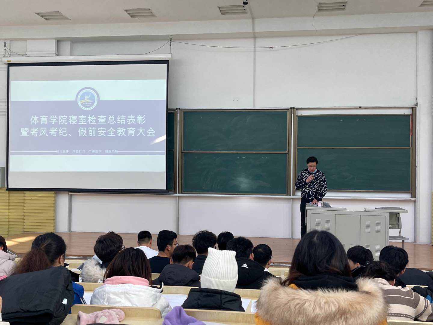 2020年12月17日中午,bb贝博艾弗森官方网站在逸夫楼第十阶梯教室召开本学期寝室检查总结表彰暨考风考纪、假前安全教育大会。学院党委副书记兼副院长田进、全体辅导员和全院本科生参加本次大会。