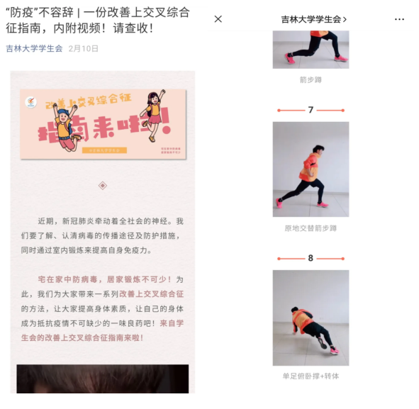 疫情期间,bb贝博艾弗森官方网站学生会协助校学生会制作了三期线上锻炼的推文,累计阅读量5000余次。推文内容是由学院学生会骨干张熙策、姜熙宁、赵偲艺等向大家普及运动常识和各种健身动作,并组建了健身打卡群,居家期间为同学们答疑解惑,分享经验。